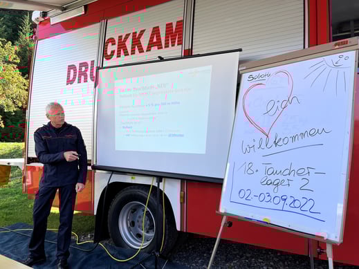 Nach dem Tauchgang wurden die Taucher auf eine Kontamination kontrolliert und freigemessen. Anschließend gab es vom OBI der Universitätsfeuerwehr Dr. Georg Wäg die Theorie zum Thema Radioaktivität.