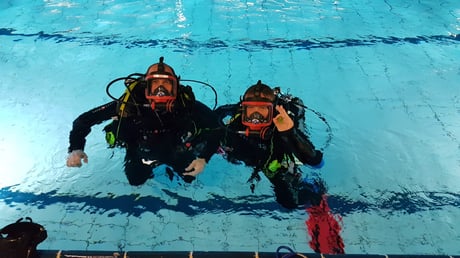 Bei der Schulung wurden das richtige Vorbereiten und Versorgen der Ausrüstung an Land geschult. Unterwasser übte man dann den Wechsel von Voll- auf Halbgesichtsmasken und das Ausblasen.
